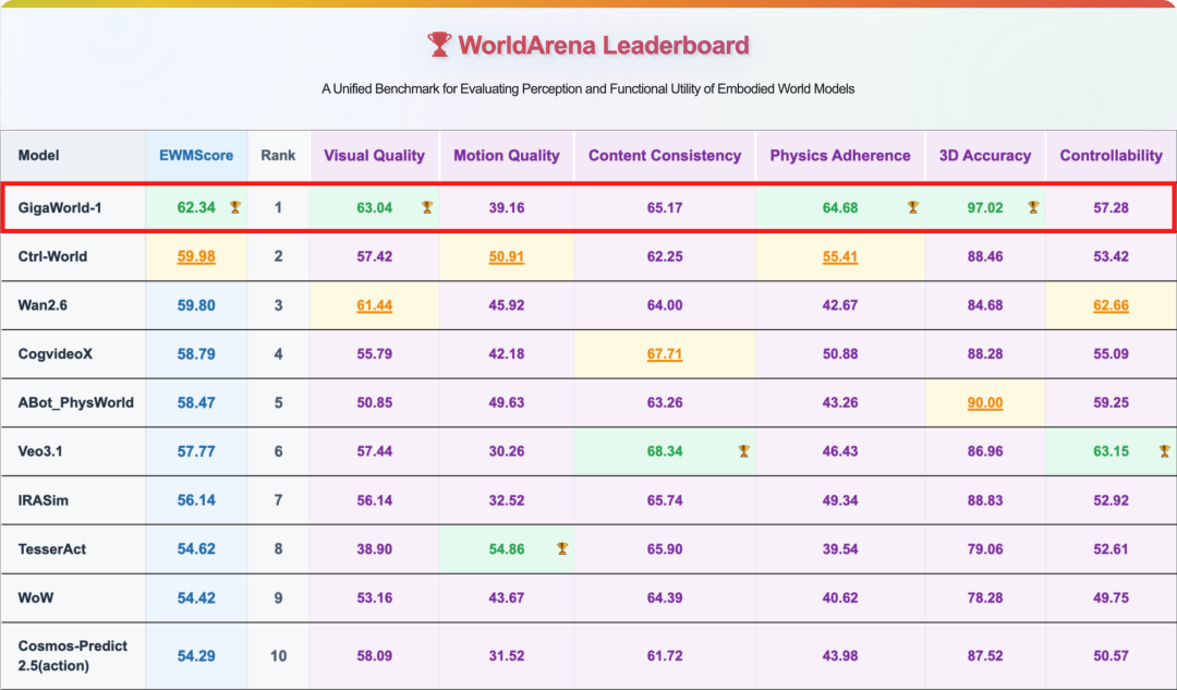 GigaWorld-1:当前全球最领先的AC-WM。在世界模型领域权威评测 WorldArena 榜单中登顶全球第一,全面超越国际顶尖巨头,成为唯一综合得分60+的具身世界模型。