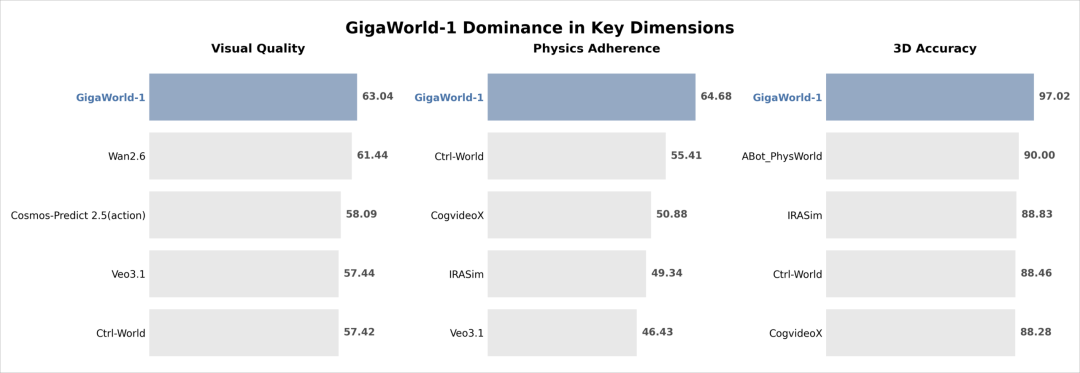 尤其在三大核心维度上,GigaWorld-1展现出了断层式的领先优势: