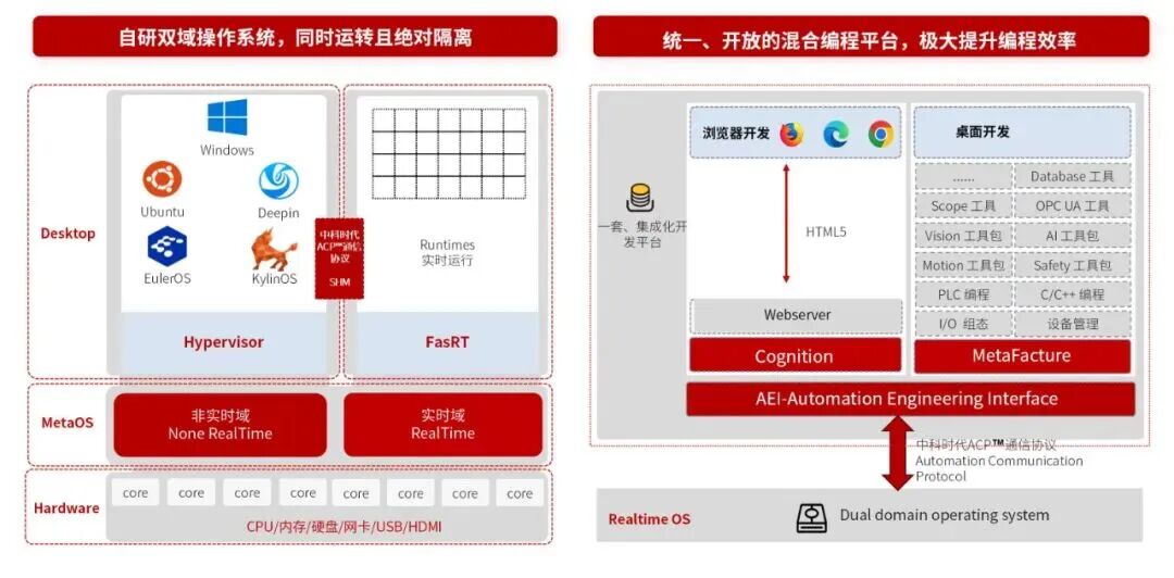 中科时代的工业智能计算机集成了实时控制、运动控制、智慧视觉、边缘计算、组态显示、人机交互、机器人等功能,具备高实时、强计算特性,硬实时任务响应速度(可稳定达到微秒级)与多轴同步运动控制实时性、稳定性与带轴能力保持全球头部最前沿水平。软件方面,中科时代自主研发的双域操作系统(MetaOS)采用双内核架构保证了控制任务的“硬实时”确定性执行,又兼容了丰富的通用IT生态,自主研发的统一开发环境(MetaFacture)具备极强开放性和可扩展性特性方便易用。中科时代从两大核心基础软件出发,构建了横向通用的软硬件平台,为我国制造业转型升级提供了强有力的支撑。